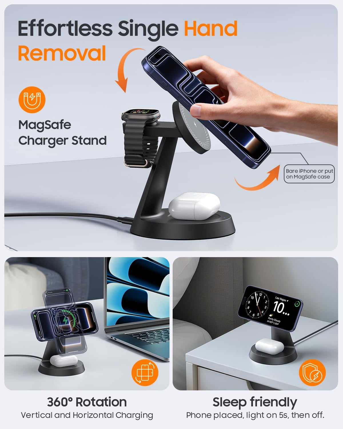 | Compatible Devices | 【Earbuds】5W Max for Earbuds: AirPods 4/3/AirPods Pro/Pro 2/3/AirPods 2(Wireless Version); Galaxy Buds4/4 Pro & other Supports Wireless Charging Earbuds, 【Phone】①25W Max: iPhone 17 Pro Max/17 Pro/17/16 Pro Max; Pixel 10 Pro XL/10 Pro Fold; Galaxy S26 Ultra ②20W Max: iPhone Air/iPhone 16 Pro/16 Plus/16(with iOS 26 or later); Galaxy S26 Plus/S26 ③15W Max: iPhone 15 Pro Max/15 Pro/15 Plus/15/14 Pro Max/14 Pro/14 Plus/14/13 Pro Max/13 Pro/13/13 mini/12 Pro Max/12 Pro/12/12 mini; Pixel 10 Pro/10; ④10W Max: iPhone 16E/11–8 series/SE Series, and other Qi-enabled phones (Require a magnetic phone case), 【Watch】2.5W Max ONLY for Apple Watch: Apple Watches Ultra 1/2/3; Apple Watches S11/S10/S9/S8/S7/S6/SE/S5/S4; Apple Watch Nike+/ Hermes; |