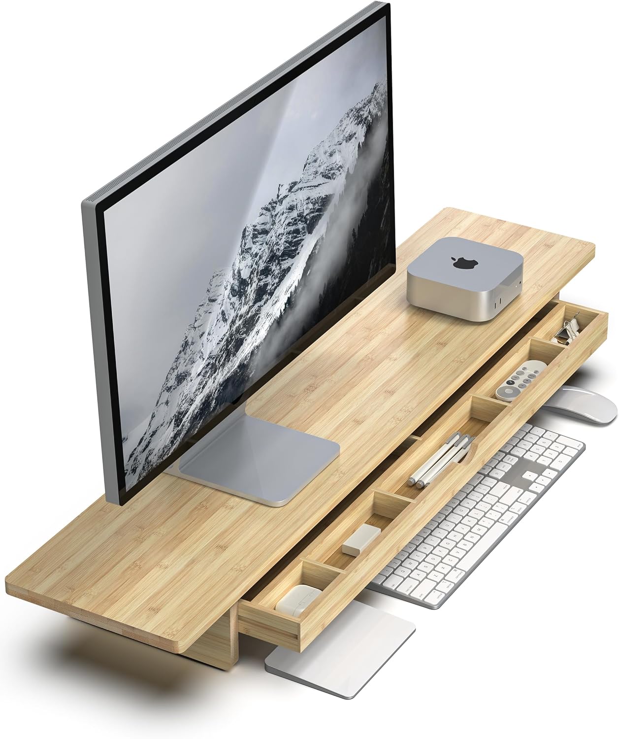 WELL WENG Large Natural Bamboo Monitor Stand: Why not create a spacious desk environment? “Two monitors but no place to put them?” “Small stationery items scattered everywhere, hard to find?” “Neck pain making it tough?”... The WELL WENG 42 Inch Wide Large Monitor Stand solves all these problems. 🌿 The Beauty and Strength of Natural Bamboo Crafted from 100% natural bamboo, its surface is meticulously hand-polished by artisans for a smooth finish that radiates natural warmth with every touch. Bamboo is harder and more durable than wood, with excellent moisture resistance. ※As a natural material, each piece varies in color and grain pattern. Enjoy this unique character as part of its natural charm. 📐 Spacious Wide Design for Dual Monitors The expansive 42 Inch-wide tabletop securely supports large ultra-wide monitors or two side-by-side monitors. With an impressive weight capacity of 220lbs, it provides a stable work environment without flexing, even under heavy equipment. 🗄️ Amazing Storage Capacity: 5 Dividers + Open Space The front drawers are more than just boxes. Left side: 5 independent compartments. Organize small items like pens, scissors, sticky notes, and SD cards without losing them. Right side: 3.74 inch tall open space. Store tall staplers, hole punches, or small bottles upright. (Note: The effective height of the compartments is 1.58 Inch. Use the open space for items taller than this.) 💻 Ergonomics and a Clean Desk Lifts your monitor approximately 4.3 inch, raising your line of sight to prevent slouching and neck strain. The space under the stand can store your keyboard and mouse. Hide them when not in use and pull them out only when needed, keeping your desktop tidy at all times. 🛠️ Easy Assembly No complicated steps. Follow the included instructions for simple assembly. Product Specifications: Brand: WELL WENG Material: 100% Natural Bamboo (Natural Color) Size: Width 42 × Depth 9.25 × Height 4.3 inch Load Capacity: 220lbs Drawer Interior Dimensions: Partition Section: Height up to 1.58 Inch Open Section: Height up to 3.74 inch Assembly Required (Simple assembly) Package Contents: Bamboo monitor stand main parts Assembly screws and tools Care Instructions: Wipe clean with a soft, well-wrung cloth. Avoid using chemicals or abrasives. We recommend storing it away from direct sunlight. Enjoy your daily work more comfortably and stylishly with the WELL WENG monitor stand, combining natural material texture with functionality.