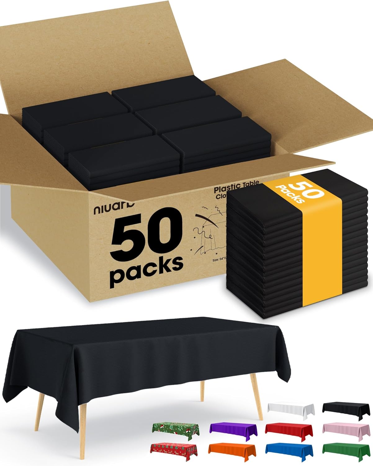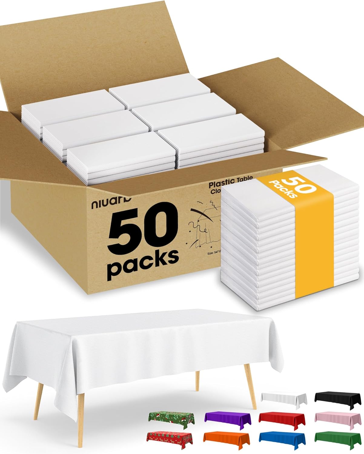 Say goodbye to long cleanup sessions after your parties—Niuara disposable plastic tablecloth makes tidying up a breeze! 1.With a size of 54''×108'', the Niuara white tablecloth for rectangle tables is perfectly designed to fit 6ft tables. Its standard dimensions ensure it’s a great match for all kinds of tables, including dining, banquet, and buffet tables. 2.Made from durable, thickened PEVA plastic, this tablecloth is built to last. It resists tears and offers reliable protection against oil, water, and spills, keeping your table spotless and stress-free throughout the event. 3.When compared to fabric table covers, the Niuara plastic tablecloth for rectangle tables is a budget-friendly choice. There’s no need to wash or store it—just dispose of it after use. Plus, it comes in a variety of colors, making it perfect for different holiday occasions like Christmas, Halloween, and Thanksgiving.